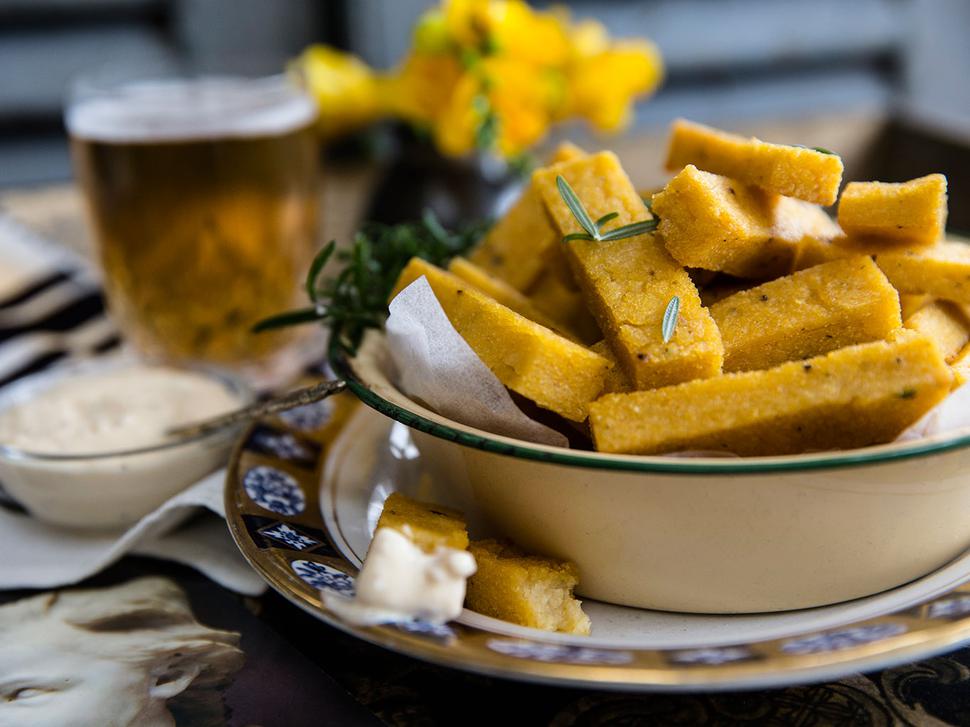 Fried cheesy polenta chips, smoked chilli and lemon.